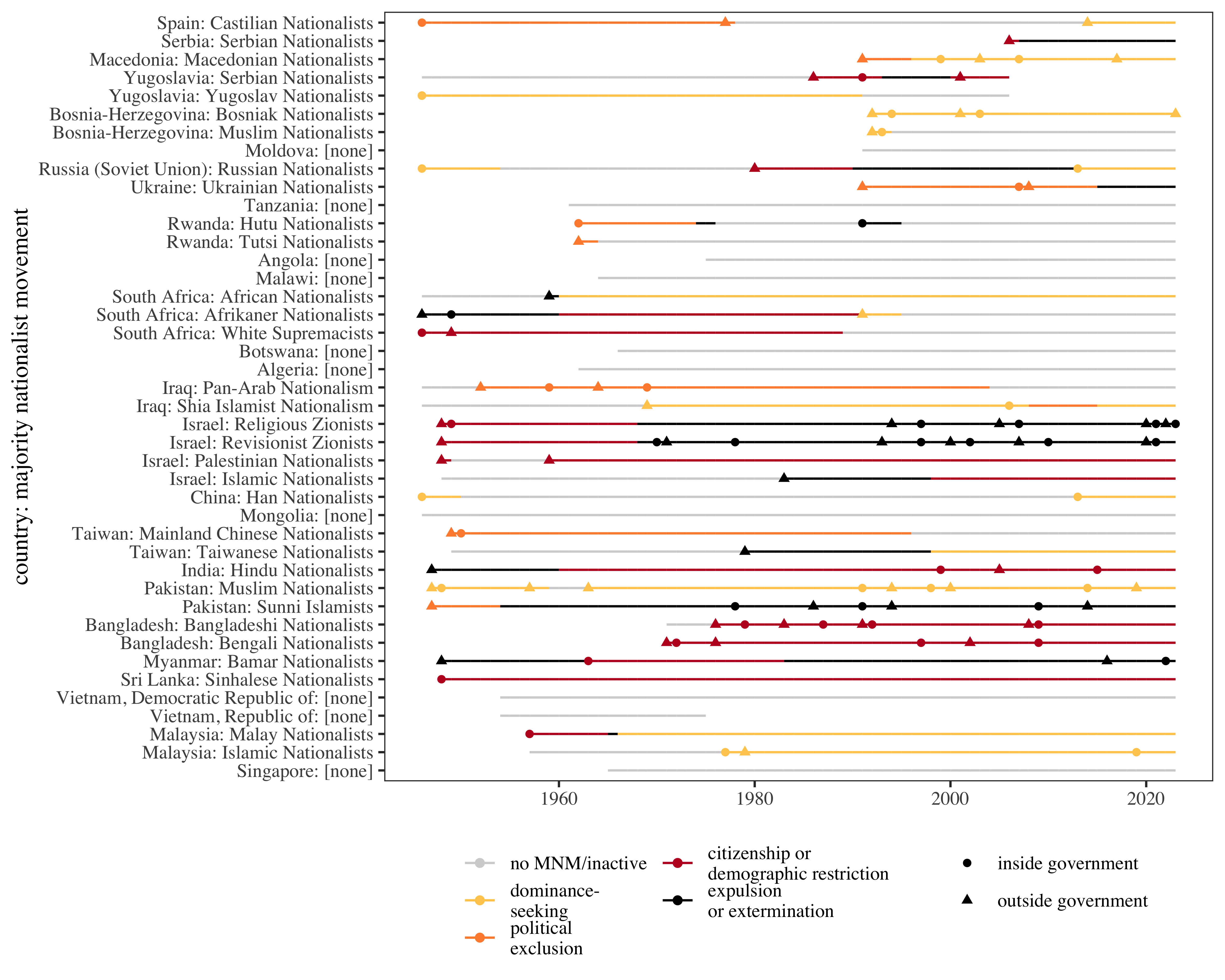As part of my project on dominant nationalism, I am currently in the process of collecting global data on dominant nationalist movements between 1946 (or independence) and 2023. For this purpose, I am leading a team of research assistants, together with Aya Abdelrahman. The Dominant Nationalist Movements (DNM) Dataset will include annual information on dominant nationalist movements’ identity basis, their demands (dominance/monopoly rule/exclusion of specific minorities/demographic engineering/assimilation/citizenship rights restrictions/expulsion/extermination/cultural/anti-autonomy/economic), their ideological justification, their territorial claims, their associated political parties, and their relationship to the government. The preliminary codebook can be accessed here.