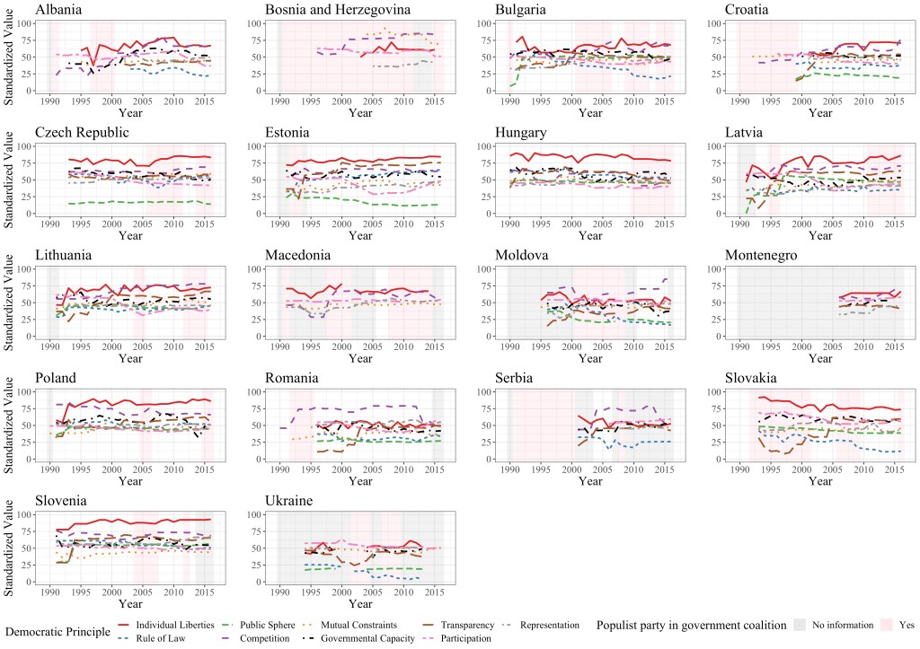 In sum, our article offers a new, systematic assessment of the alleged illiberal turn of Central and Eastern European democracies. We find correlational evidence consistent with some of the purported democratic consequences of populist governments and the EU accession process. However, our analysis does not point to a general trend of democratic backsliding in Central and Eastern Europe, at least until 2016. Moreover, the explanations we have investigated – populism, EU accession fatigue, and the 2008 financial crisis – are clearly neither sufficient or necessary on their own to explain any erosions of democratic quality we detect.