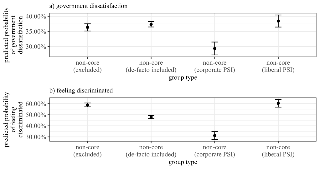 My results support my arguments. First, using hierarchical multi-level models, I find that corporate power-sharing reduces grievances more substantially than its informal and liberal alternatives. In additional group-level analyses, I examine the mechanisms driving this finding. These indicate that corporate power-sharing institutions not only guarantee that minorities initially attain representation, but also that these gains remain durable, which in turn substantially alleviates grievances.