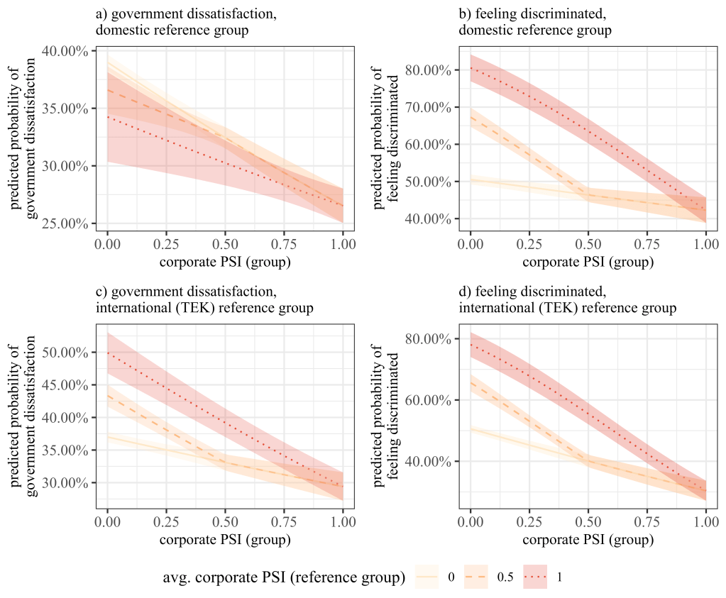 Second, however, my multi-level models also indicate that minorities are more likely to form grievances where they attain relatively lower degrees of corporate power-sharing than their domestic ‘peers’ or their transnational kin groups. These findings are robust to alterations in the dependent variable, changes in sample composition, and a large battery of controls. They are also reflected in a group level measurement model approach, which combines my underlying question items into a latent variable tapping into group grievances.