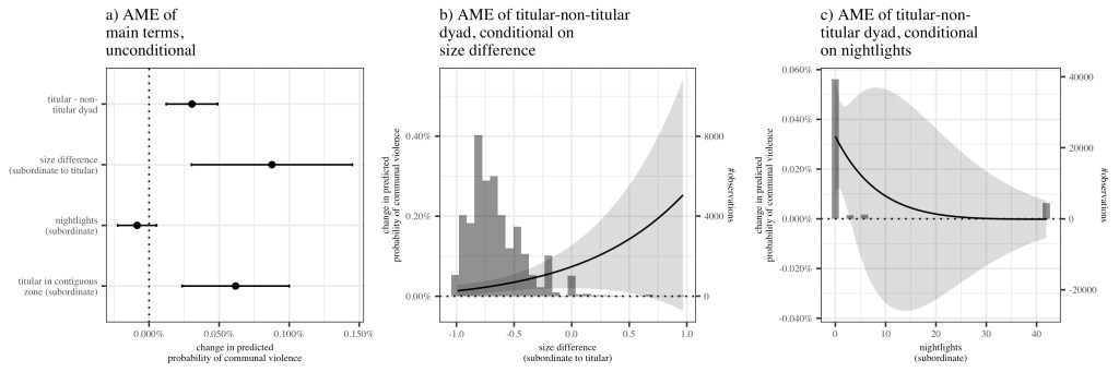 - Communal violence is far more likely to break out between two groups in a zone, if one of these groups is titular, whereas the other is not. This mirrors our argument that ethnofederalism fosters tensions between regional majorities and minorities that may escalate into communal violence (figure 2, panel a, line 1).