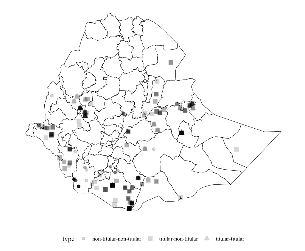 - Finally, the risks of communal violence are also higher where non-titular groups are titular in other zone closeby. Such situations may foster mutual distrust, give rise to commitment problems, and thereby prevent peaceful solutions to local tensions. Simultaneously, they may generate conflict over local boundaries. An example is the conflict between ethnic Guji and Gedeo, each of which has its own designated ‘homeland’. However, substantial proportions of each group settle on the ‘wrong’ side of the border in the other group’s adjoining ‘homeland’, leading to tensions in both zones and between them over zonal boundaries.