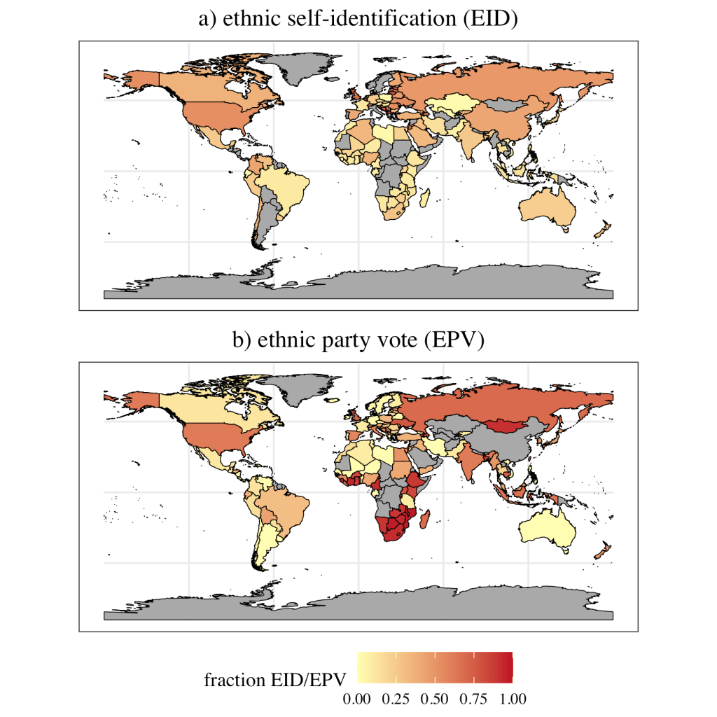 To test these arguments, I rely on new, globally representative survey data from my SEAMS database. I capitalize on two individual-level measures which capture two key aspects of ethnic salience: First, the degree to which individuals privilege their ethnic over their national identity; and, second, whether they intend to vote for ethnically based parties (see figure below). As the resulting sample encompasses more than 900,000 respondents from 132 diverse countries, my findings not only offer the first direct attitudinal evidence on the relationship between power-sharing and ethnic salience, but also contribute to a growing cross-national literature on ethnic salience more broadly.